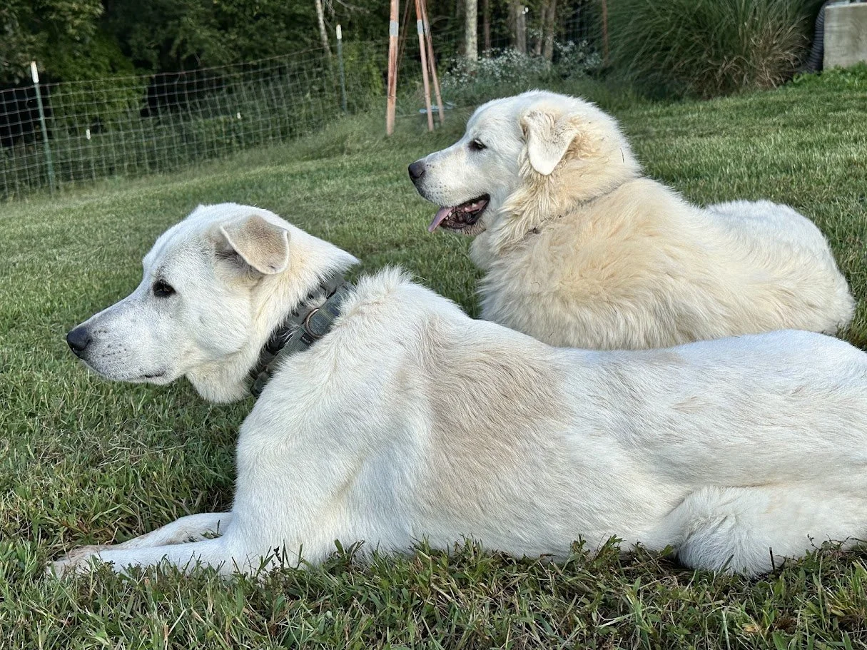 Samara is now almost a year and a half, and she has calmed down and settled in. She and Akiva are finally starting to work together and to become friends. It’s incredible to see them working together; they have their own shorthand and seem to know what the other is thinking. I’m so grateful for them. I had to raise them to be nice to people because we have so many visitors, but I do not for a second doubt that they would defend anyone on this farm from any threat, whether from people or otherwise. I always caution visitors that I highly recommend not going onto a farm with two livestock guardians unless you know the family is expecting you. It’s their job to keep you out. I don’t want anyone to think that these two wagging tail greeters are normal.