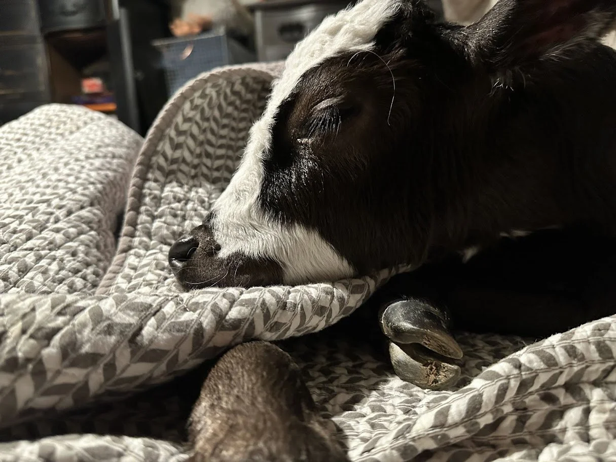 SANJAY is a mini cow-calf who could not stand or walk when I picked him up on his second day. He lived in the RV with Buddha and Denise for months. His front right leg was damaged during a difficult birth which resulted in him getting stuck in the birth canal long enough that they thought he was dead. Luckily, they noticed he kicked his foot and they quickly moved to a cesarian birth to save him.